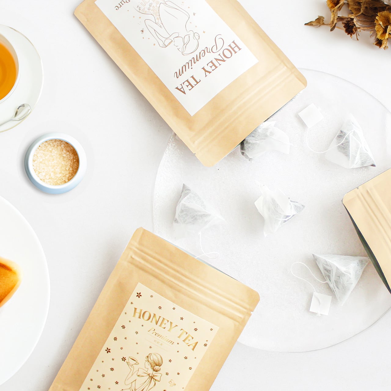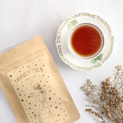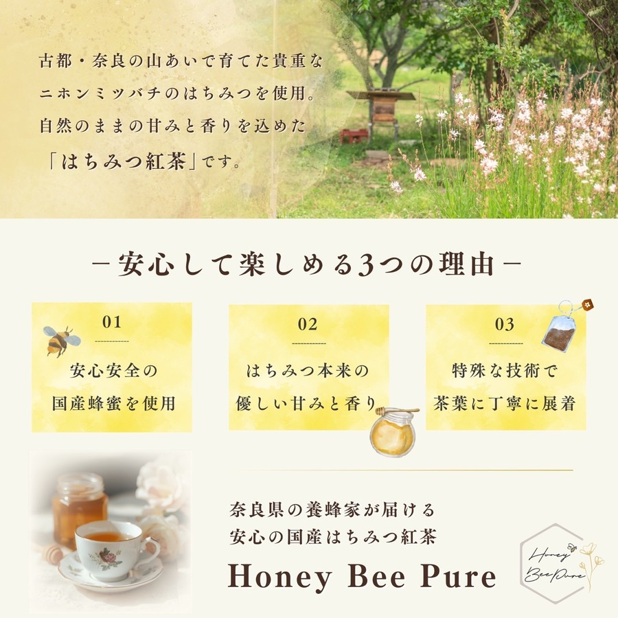 奈良の養蜂家がつくる“ホンモノのはちみつ”を、やさしい香りとまろやかな味わいが特徴の静岡県産和紅茶の茶葉に、特殊な技術で丁寧に展着。